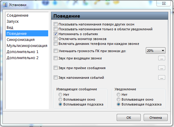 Звук и уведомления программы корректируются во вкладке «Поведение».