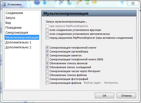 Настроить запуск синхронизации данных и разделы телефона, с которых берутся данные для резервного копирования, можно в «Мультисинхронизация».